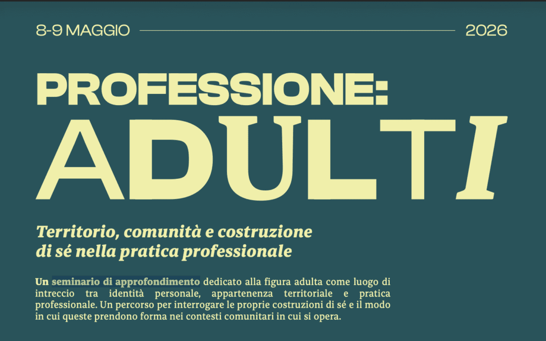 L’8 e 9 maggio 2026 si terrà il seminario “Professione: Adulti”, un percorso di approfondimento dedicato alla figura adulta come luogo di intreccio tra identità personale, appartenenza territoriale e pratica professionale.